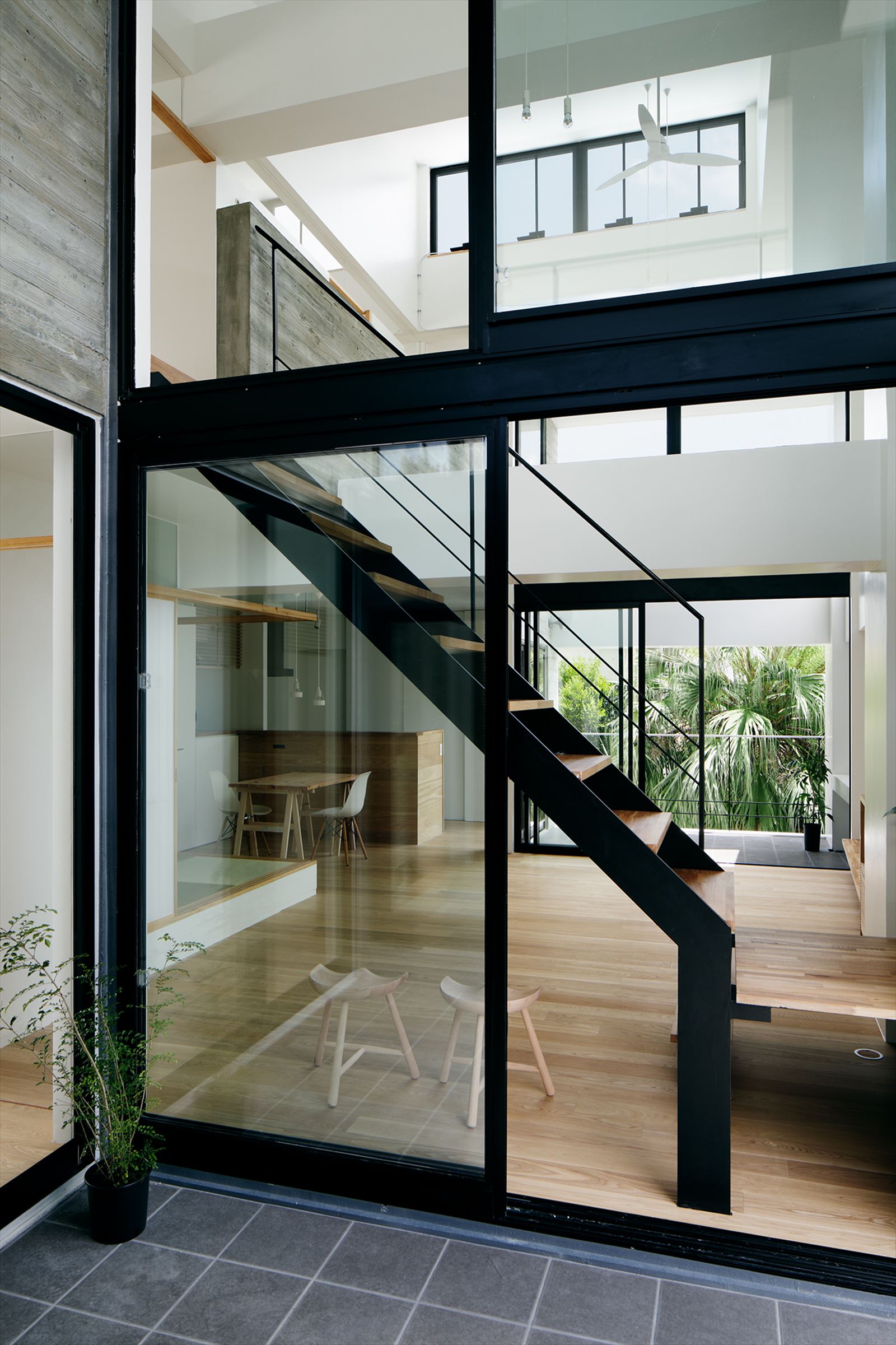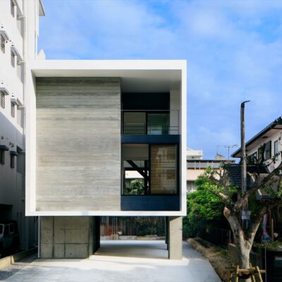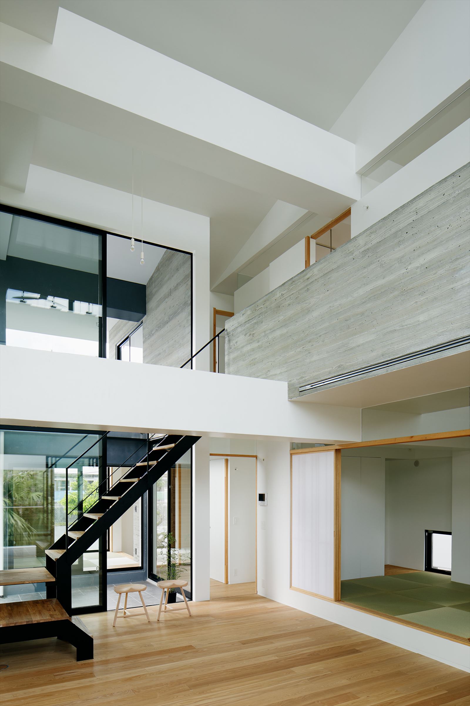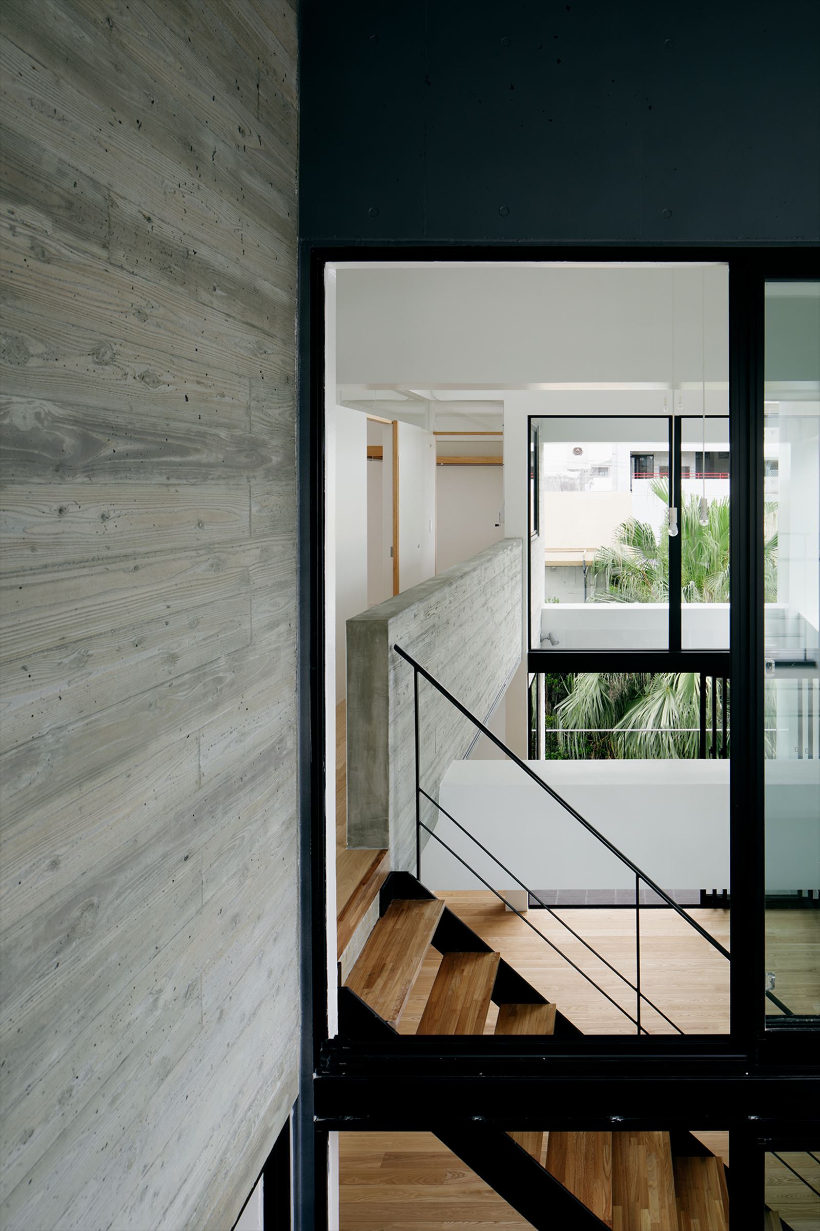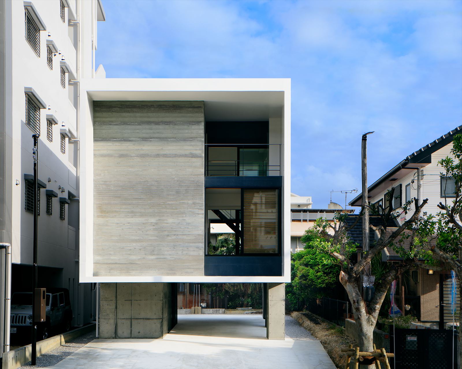 本敷地は那覇市の空港近くに位置し、比較的高密度な住宅街にある南北長い敷地である。都市型と呼べる周辺環境の中でも都市のスキマを見出し、そのスキマを建築的にもつなげることにより、周囲環境から生活を守りつつも、風や光をとり入れ快適な住環境をつくりだすよう考えた住宅である。同時に都市(まち)に対しても、都市の余白と余白をつなげることにより、視線の抜けや風の通り道を都市(まち)と共有できればと考えて計画した。