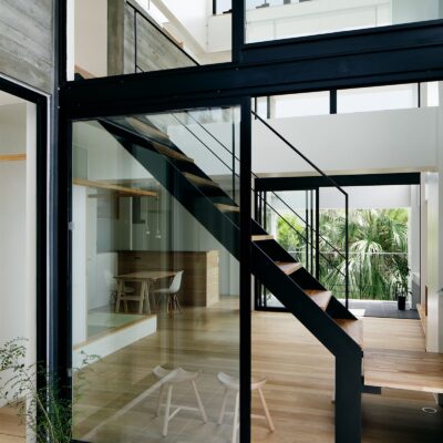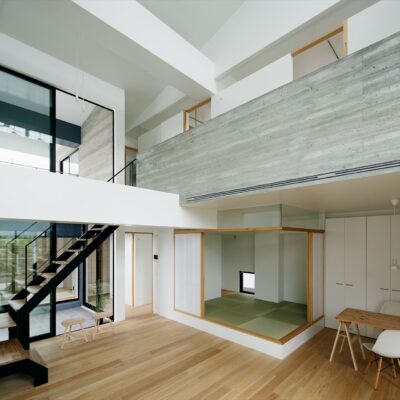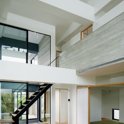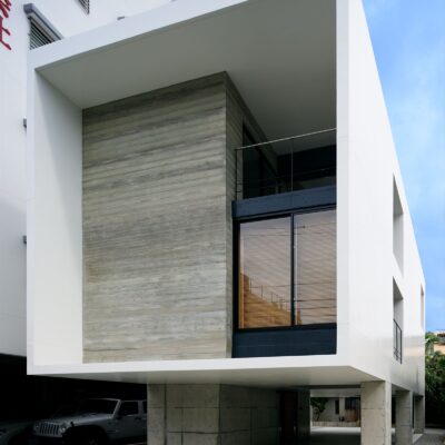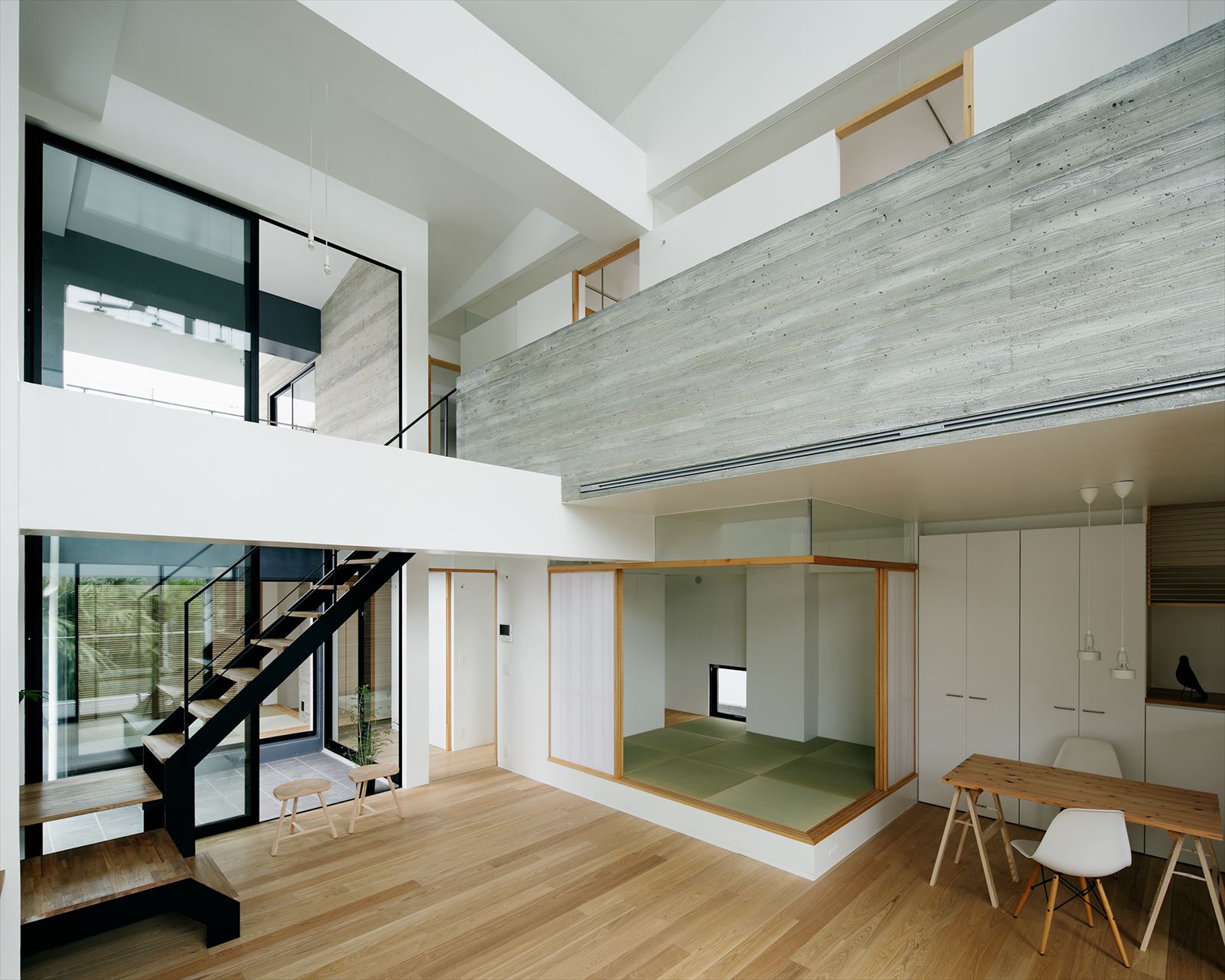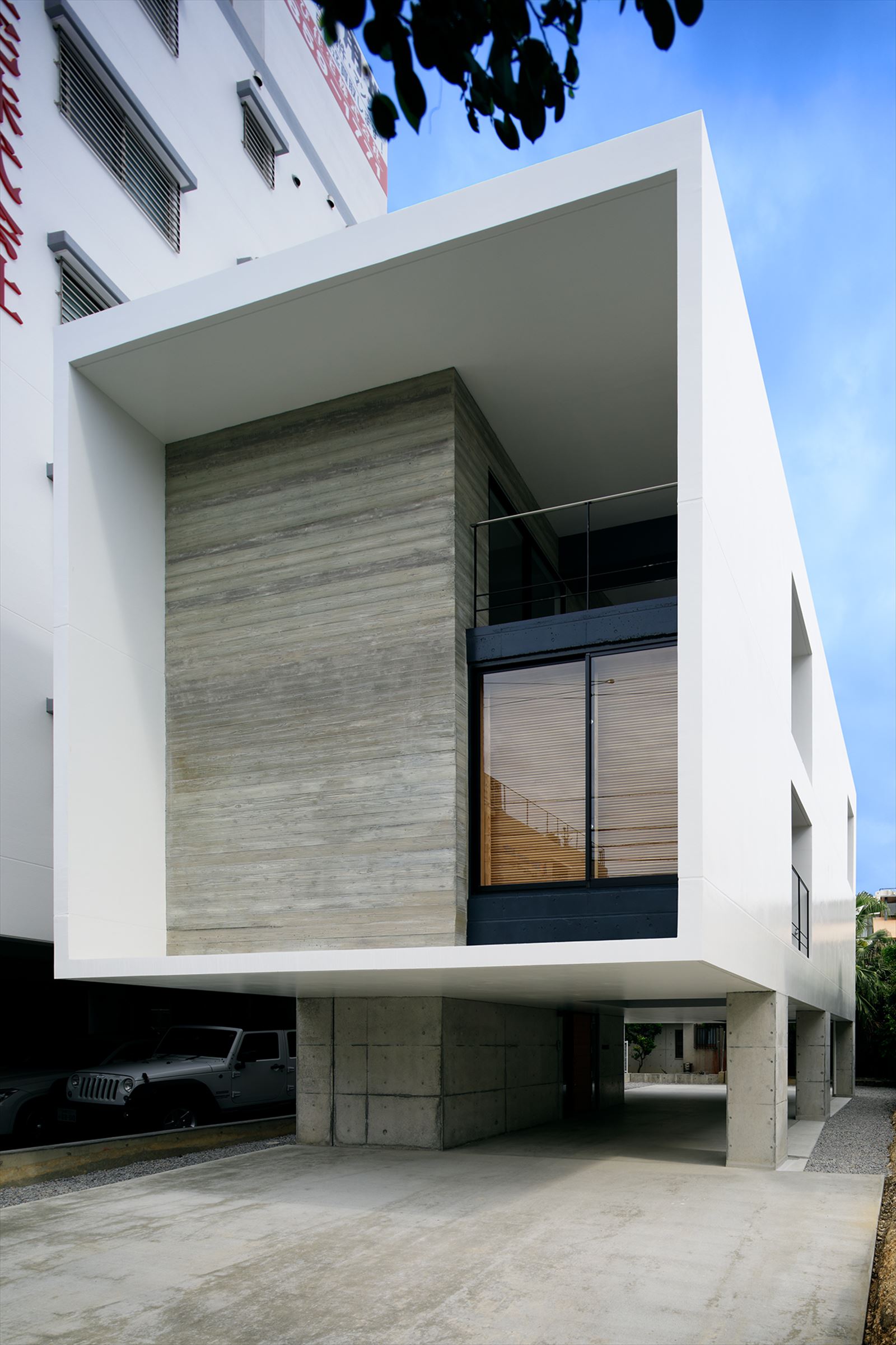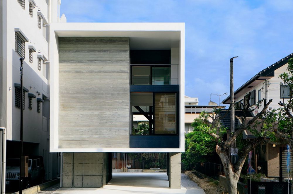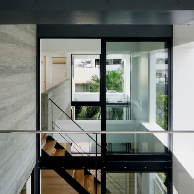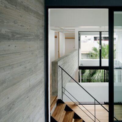 本敷地は那覇市の空港近くに位置し、比較的高密度な住宅街にある南北長い敷地である。都市型と呼べる周辺環境の中でも都市のスキマを見出し、そのスキマを建築的にもつなげることにより、周囲環境から生活を守りつつも、風や光をとり入れ快適な住環境をつくりだすよう考えた住宅である。同時に都市(まち)に対しても、都市の余白と余白をつなげることにより、視線の抜けや風の通り道を都市(まち)と共有できればと考えて計画した。