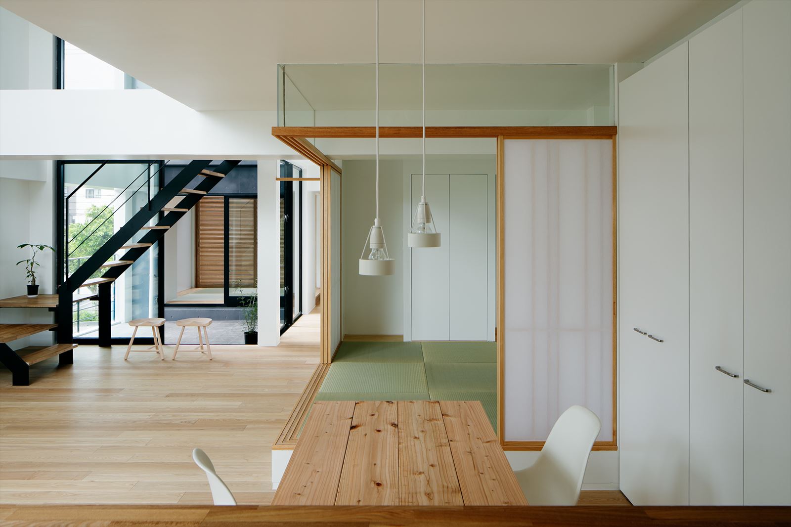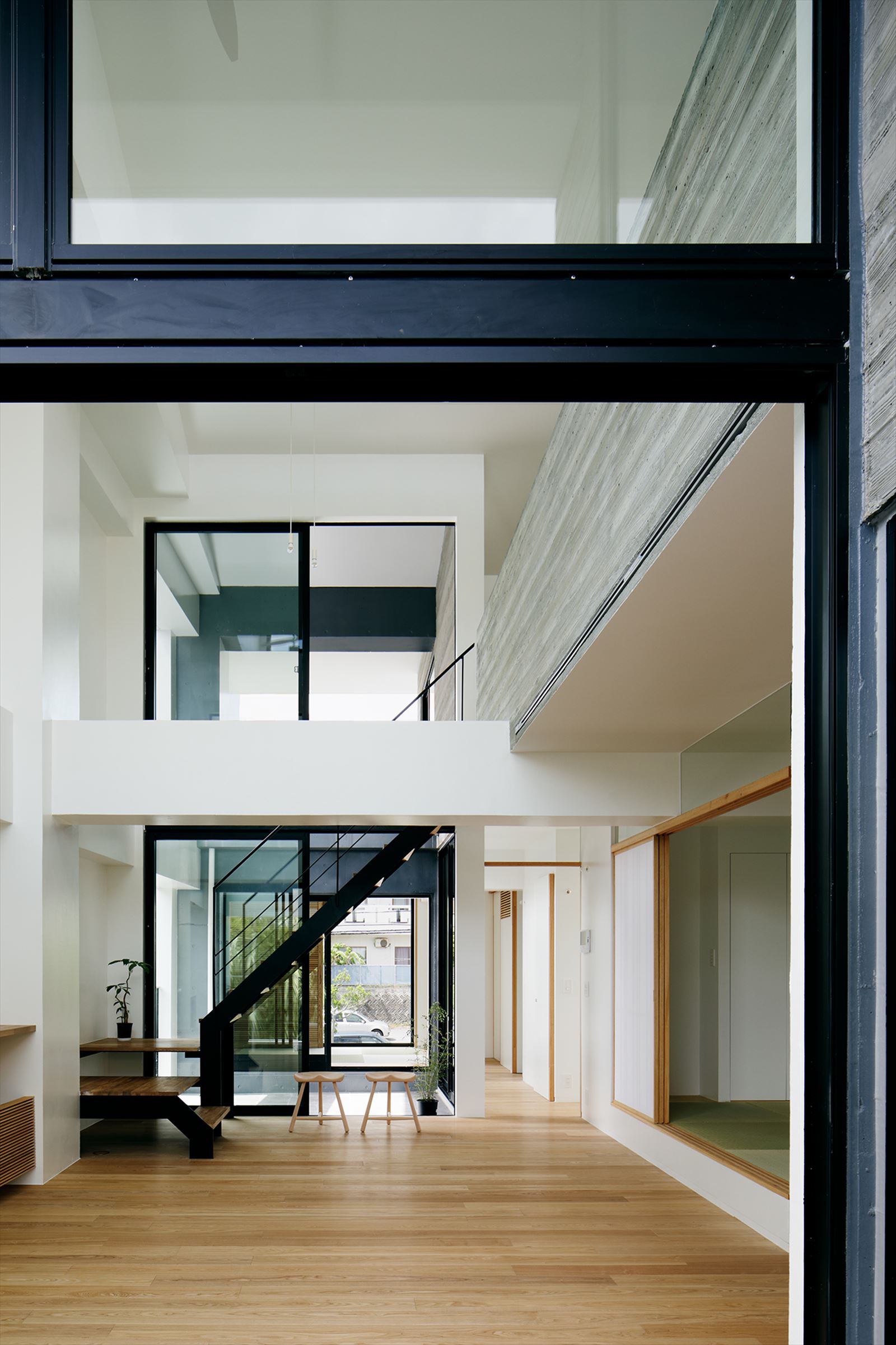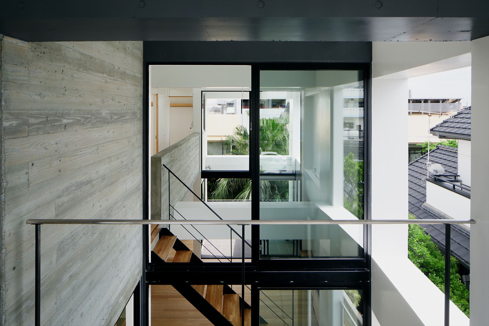 南北軸に見出した都市のスキマにあわせて、住宅のなかにも風、光、視線のとおりみちを導入した。さらに南北長い平面になるための途中にテラスを挿入することにより、光と風をより取り込みやすくするように設計した。窓の開け方は、プライバシーと日射をコントロールするためにテラスなどを介して設けるようにして、直接外部に面する窓は東側のみにとどめた。
