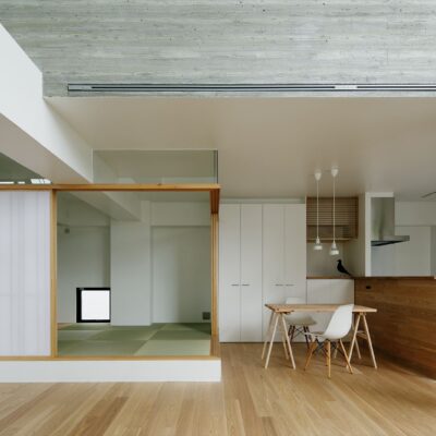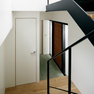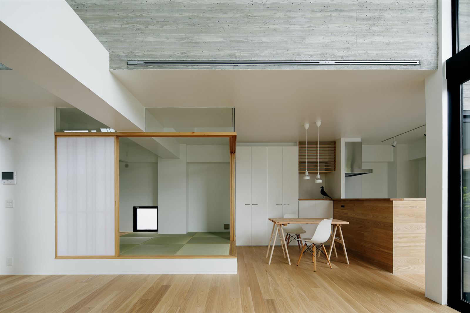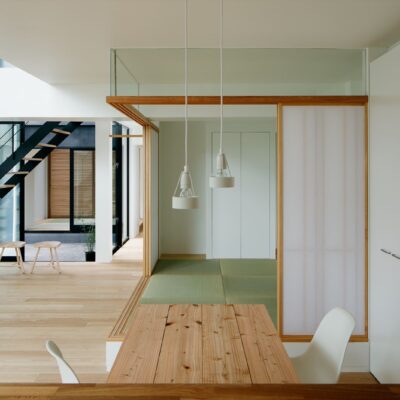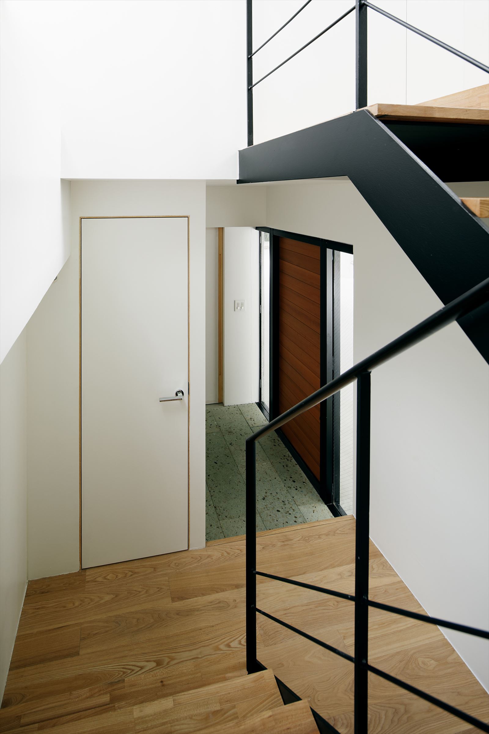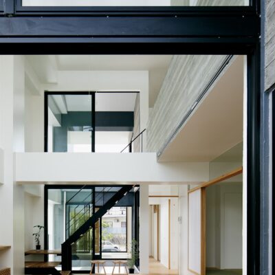南北軸に見出した都市のスキマにあわせて、住宅のなかにも風、光、視線のとおりみちを導入した。さらに南北長い平面になるための途中にテラスを挿入することにより、光と風をより取り込みやすくするように設計した。窓の開け方は、プライバシーと日射をコントロールするためにテラスなどを介して設けるようにして、直接外部に面する窓は東側のみにとどめた。