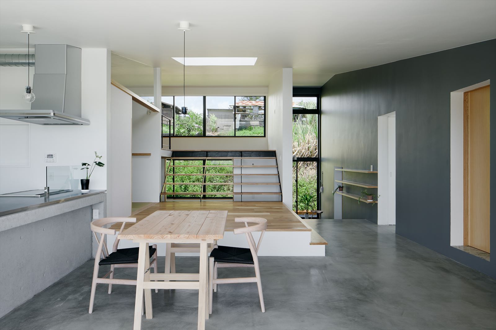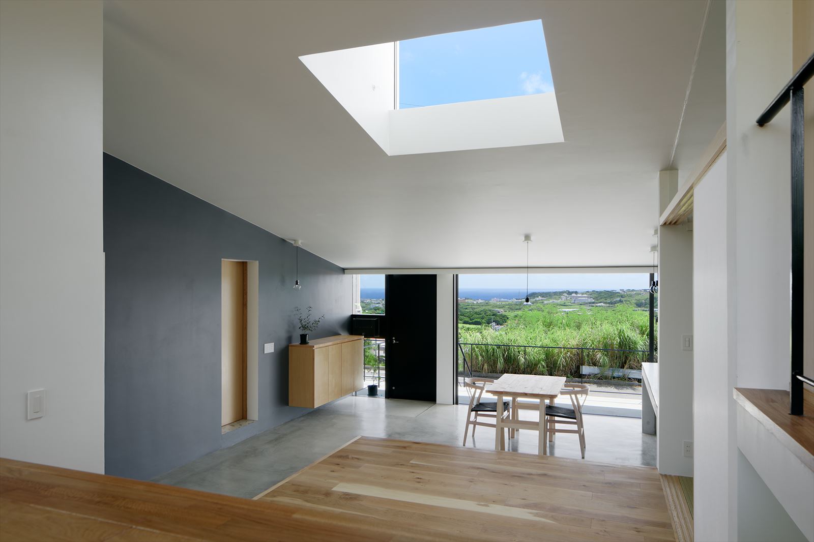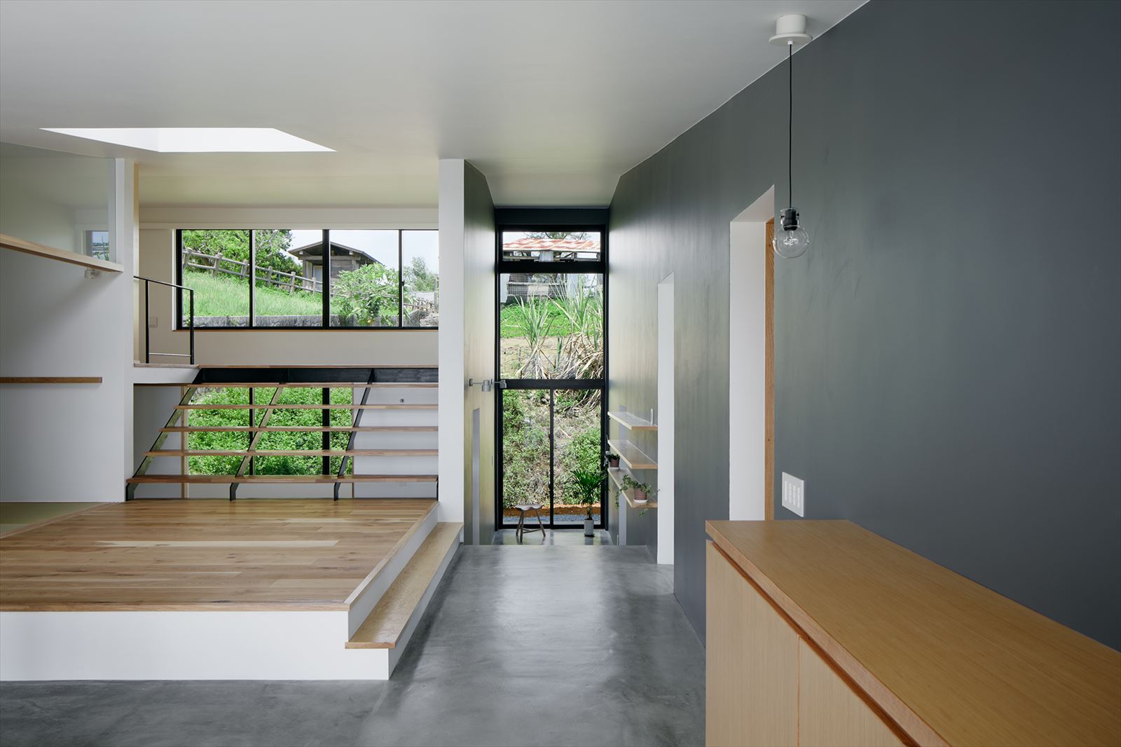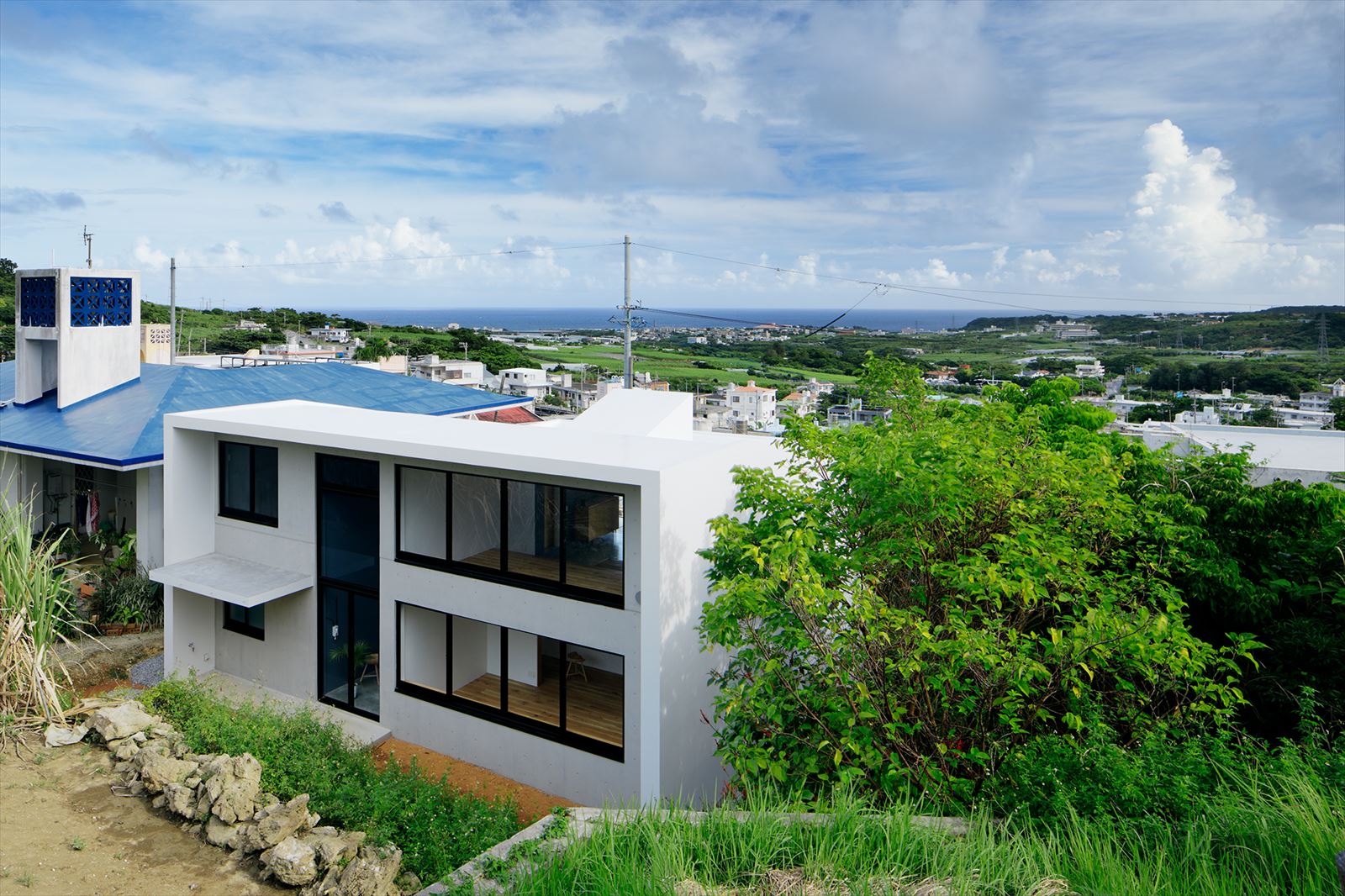 本敷地は玉城市の南斜面にある集落の最上部に位置し、南側より海を望めるロケーションにあり、敷地は道路レベルより1.2mほど高い位置にある。丘の斜面に沿った形態と断面を持つことにより自然環境に寄り添う住宅を目指した。南北に開口を設置した、この住宅は内部からはいろいろな場所から海や緑を含む風景を眺め感じられ、かつ視線が斜面を沿って通り抜けることによって外部を取り込み敷地の原風景を残せたらと思い計画した。