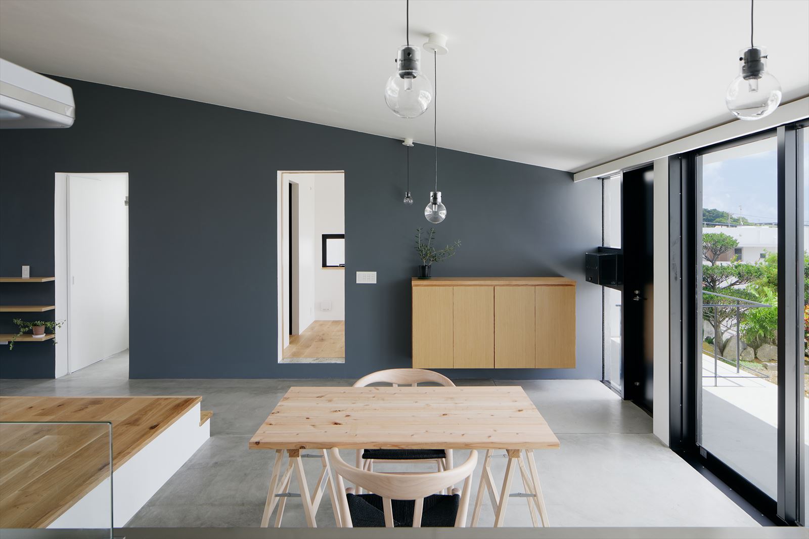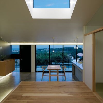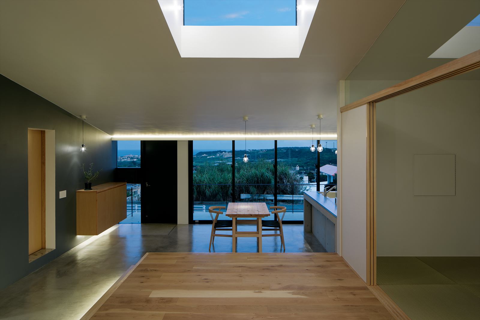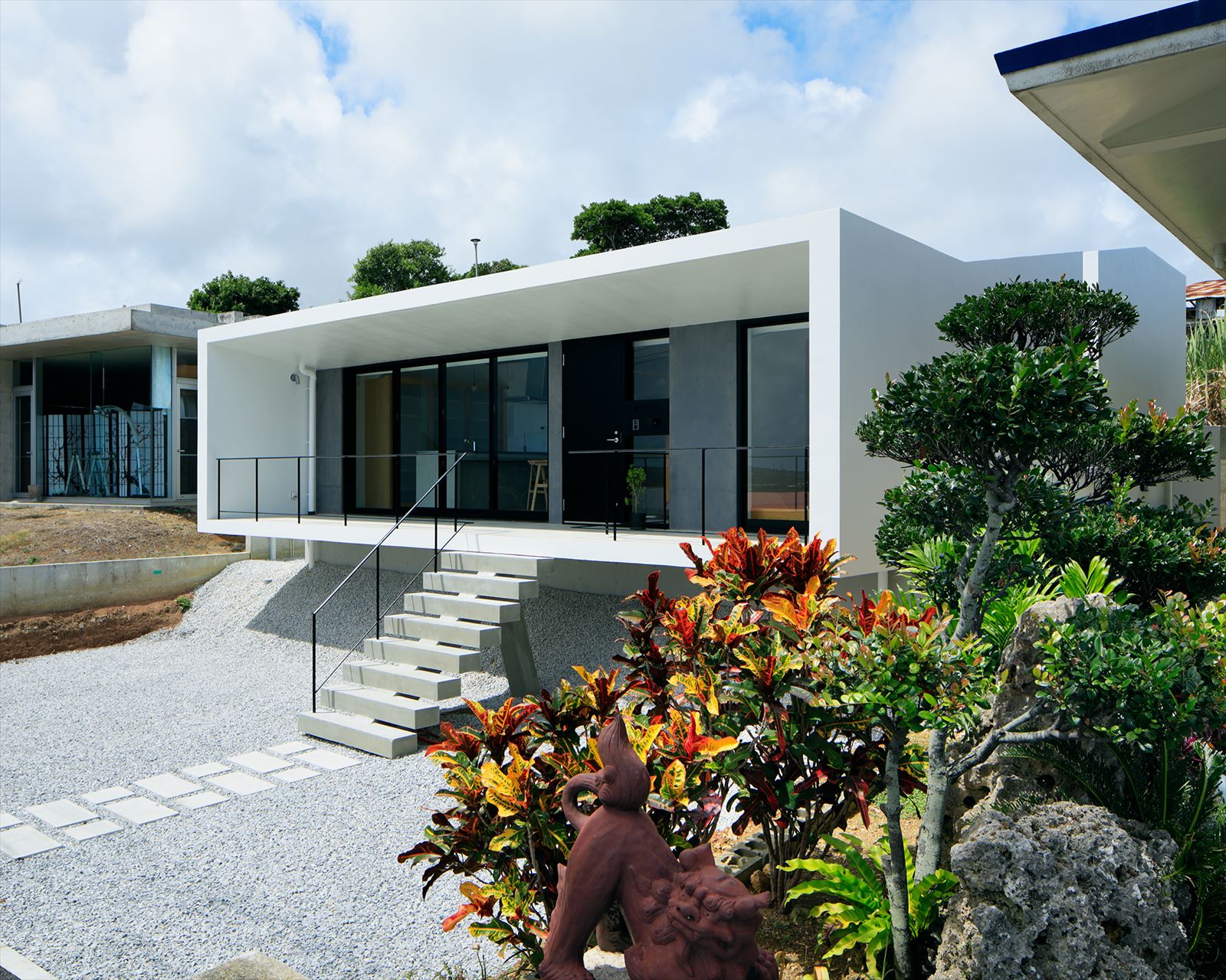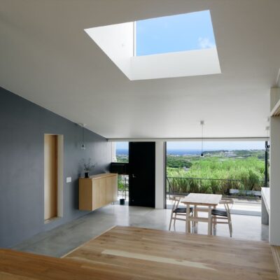本敷地は玉城市の南斜面にある集落の最上部に位置し、南側より海を望めるロケーションにあり、敷地は道路レベルより1.2mほど高い位置にある。丘の斜面に沿った形態と断面を持つことにより自然環境に寄り添う住宅を目指した。南北に開口を設置した、この住宅は内部からはいろいろな場所から海や緑を含む風景を眺め感じられ、かつ視線が斜面を沿って通り抜けることによって外部を取り込み敷地の原風景を残せたらと思い計画した。