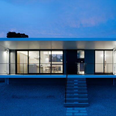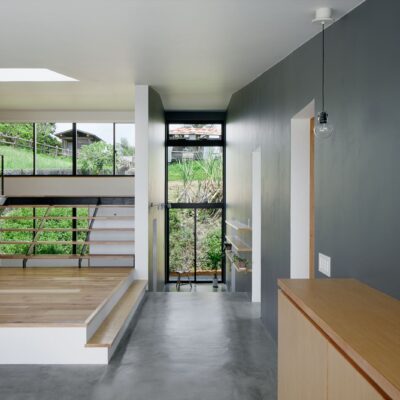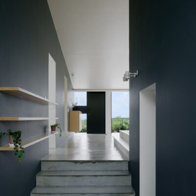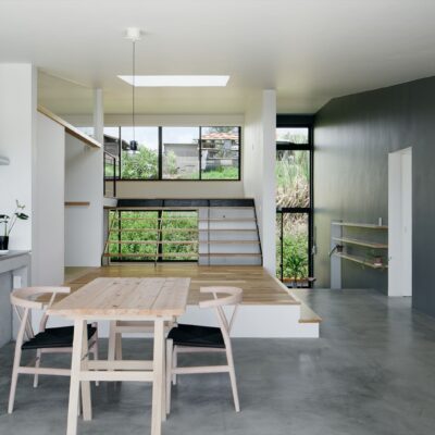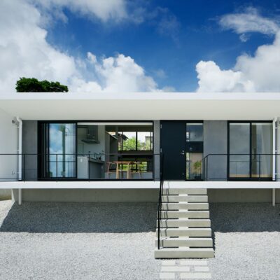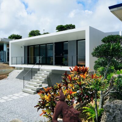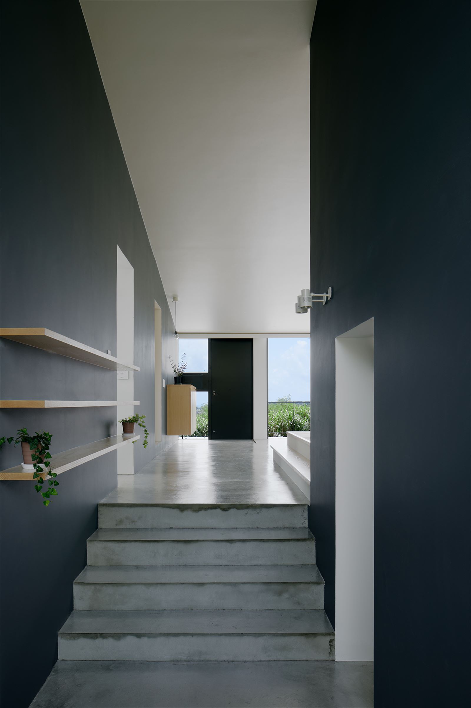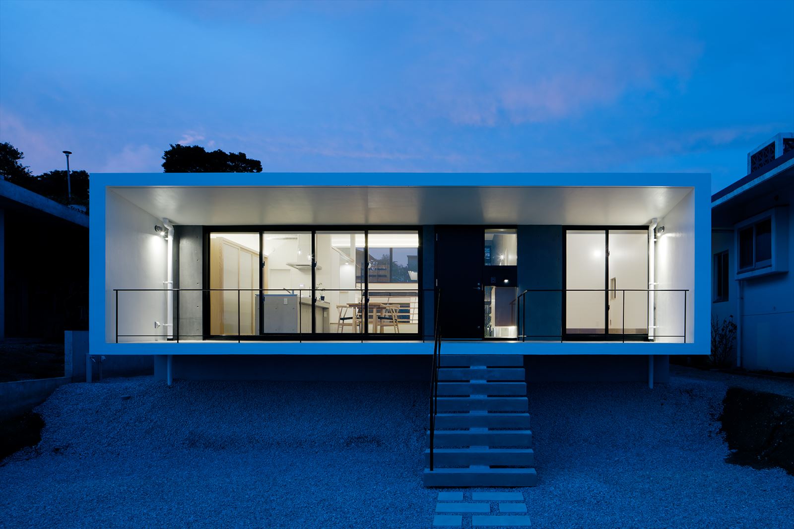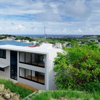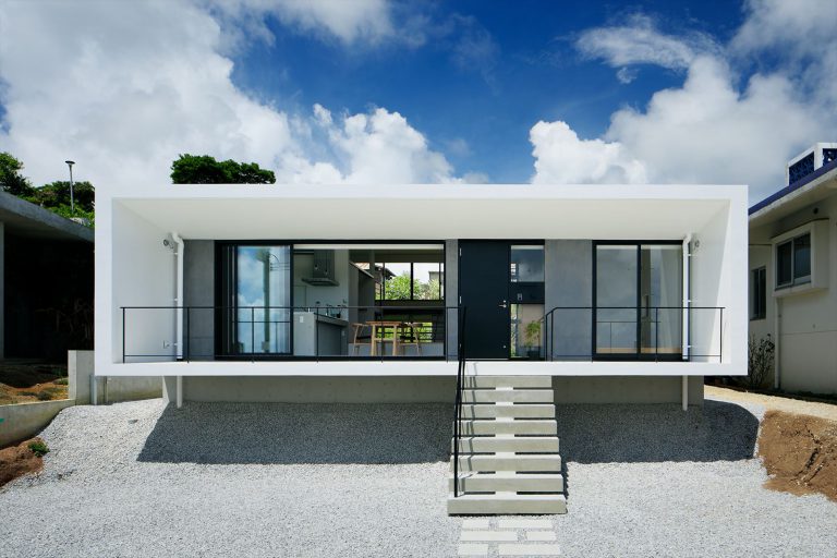 本敷地は玉城市の南斜面にある集落の最上部に位置し、南側より海を望めるロケーションにあり、敷地は道路レベルより1.2mほど高い位置にある。丘の斜面に沿った形態と断面を持つことにより自然環境に寄り添う住宅を目指した。南北に開口を設置した、この住宅は内部からはいろいろな場所から海や緑を含む風景を眺め感じられ、かつ視線が斜面を沿って通り抜けることによって外部を取り込み敷地の原風景を残せたらと思い計画した。