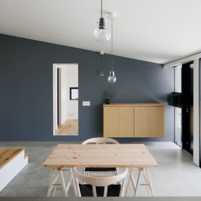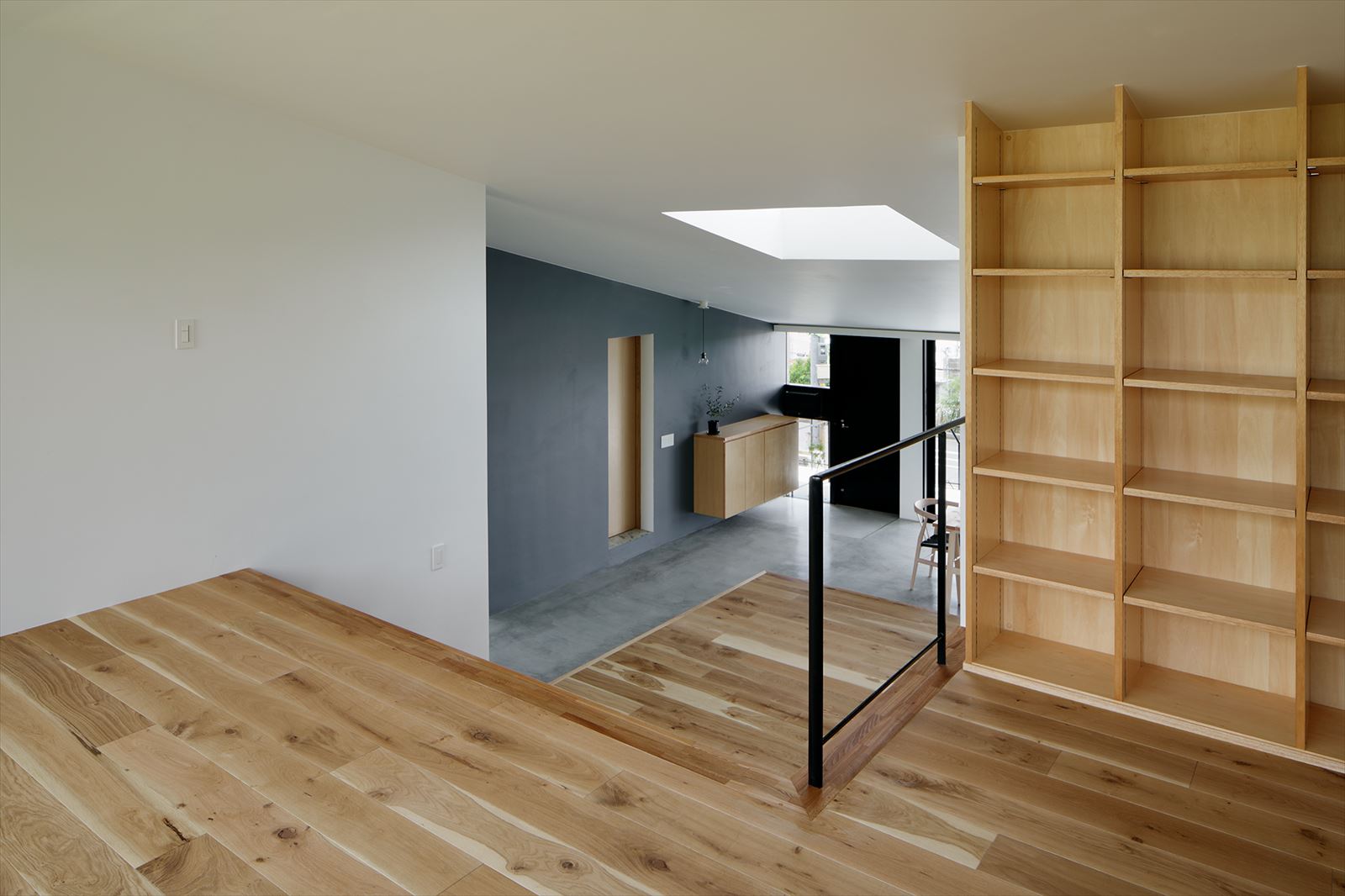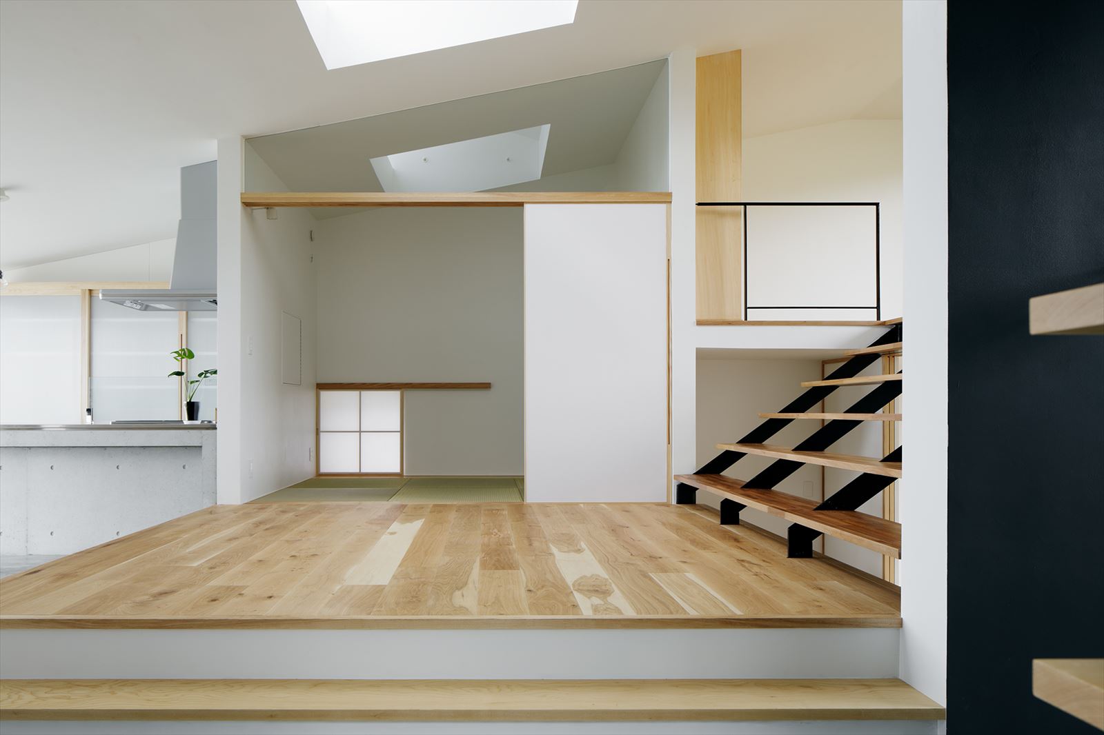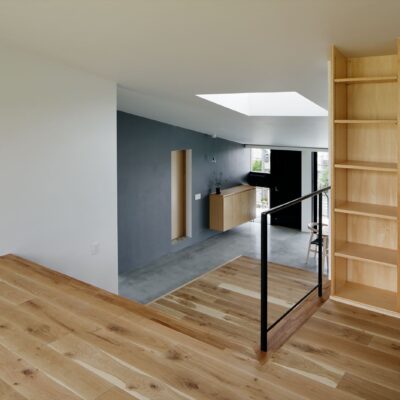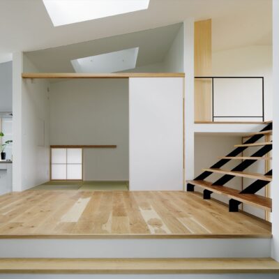南北に抜ける白い壁とスラブで構成した外皮にプライベート部分を内包した閉じたボリュームを挿入して余白部分をパブリックスペースとして計画の基本とした。住宅からの眺めと前面道路からの距離を確保するため、現状地盤より1m上げたレベルをメインの空間として設け、奥に行くに従い丘を上がるように空間は途中から0.5層ずらした2層の空間を挿入することにより構成している。