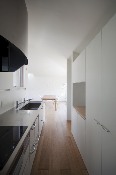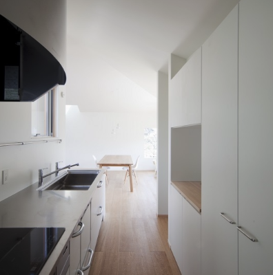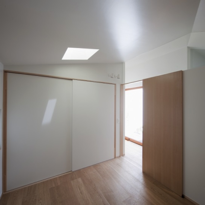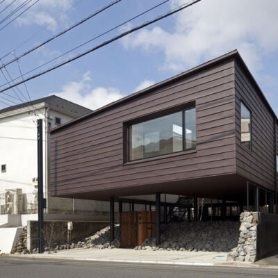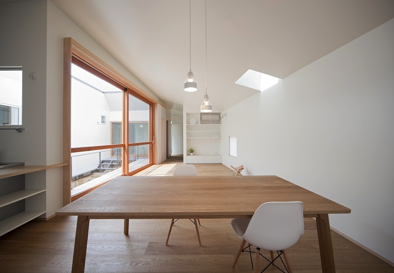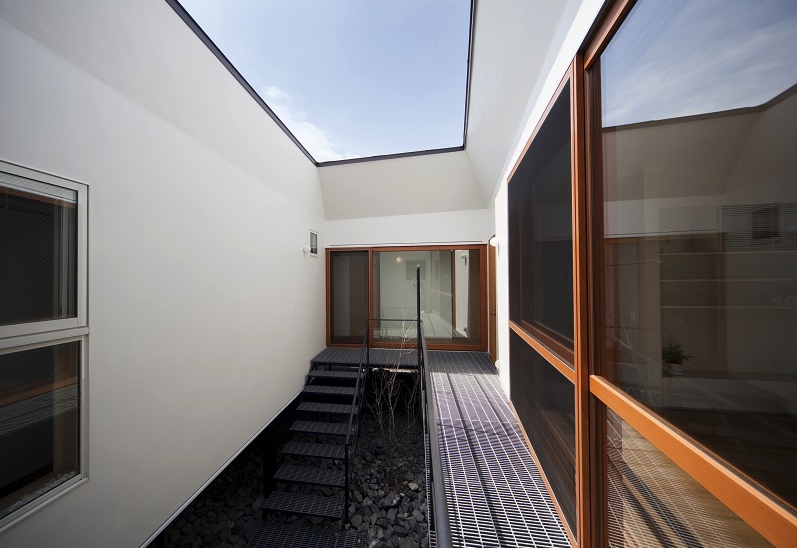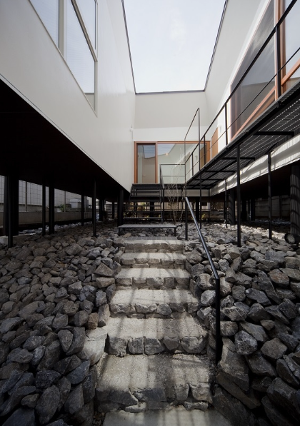 本計画地は東京郊外にありかつての商店街終端に位置している。交通量と通行者数が比較的に多い道路より1m程度高い位置にあり、敷地の南側には敷地境界線近くまで隣家が建っている。中庭をもつ平屋の建物を地面から浮かせた高い場所に計画することにより採光、通風、周囲環境との関係性を快適な生活を送れるよう努めて設計を進めてきた住宅である。